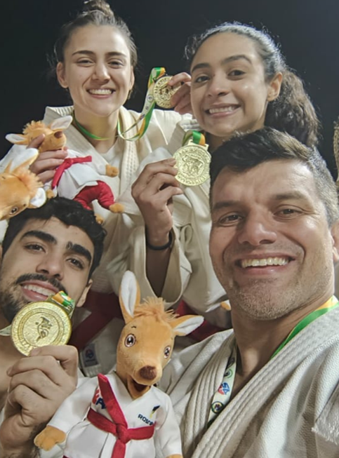 Rakel Santos (topo à esquerda), Natassia dos Anjos (à direita), Gabriel dos Anjos (baixo à esquerda) e Felipe Oliveira (à direita): medalha de Ouro no Pan American Sambo Championships 2024.